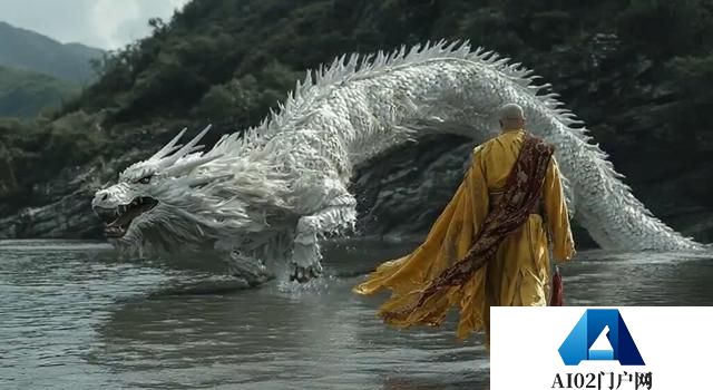 由斯坦尼康稳定器跟踪拍摄:一条龙潜入水中,僧人举起双臂以示赞赏。