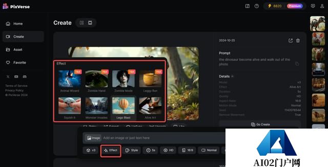 这些万圣节模版包含在 PixVerse V3 全新上线的 Effect 功能中。使用起来很简单,上传图片后,选择你想要的效果点击即可进行生成,这中间不需要再费心思输入 Prompt 了,对一门心思都想着万圣节的人来说非常友好。