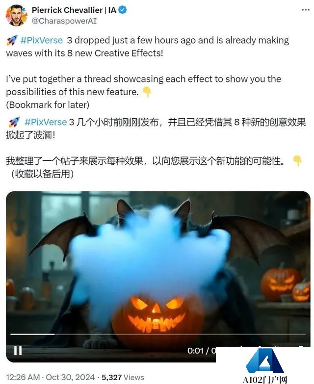 社交平台 X 上,很多 AI 产品的关注者已经开始上手 PixVerse V3,比如粉丝众多的 Pierrick Chevallier。他甚至整理了一个专门的帖子来展示自己用 PixVerse V3 生成的视频。除了强大的生成能力以外,吸引人眼球的是他在其中展示了很多非常「万圣节味儿」的视频。