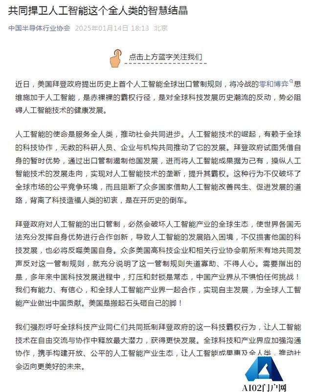 据新华社,针对拜登**1月13日发布人工智能相关出口管制措施,外交部发言人郭嘉昆1月14日在例行记者会上答问时表示,中方对此坚决反对,将采取坚定措施维护中国企业正当合法权益。
