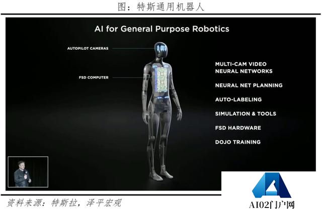 人形机器人不同于以往的机器人。AI超级应用的人形机器人指的是“具备高度自动化、智能化、集成化的通用机器人”。类比AI就像是“通用智能与机械智能”的区别。传统机器人如工业机器人、服务机器人和特种机器人技术已经较为成熟:在工业领域的移动搬运、自动物流、工业制造、电网自动巡检等;服务领域的家用扫地、酒店自动配送等已经有大量的商用案例。而以特斯拉Optimus为代表的通用机器人不限于特定应用领域,在设计上可以像人一样从事各种复杂的、高难度任务,因此对大模型的算法和算力水平要求更高。