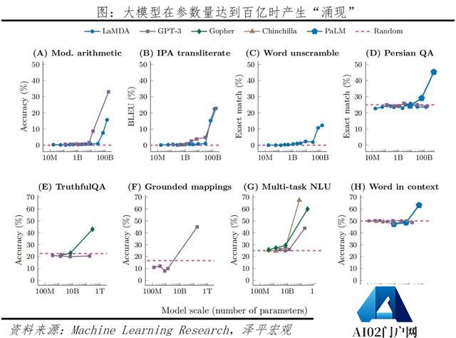 大模型与其他模型最大的区别在于“涌现”能力,出现类人的“思维方式”。在预训练阶段,随着模型规模的扩大和参数量提升,在超过某一阈值后,模型准确度突然大幅提升,例如GPT-3、PaLM、LaMDA等模型在参数量达到百亿级别时表现出涌现。