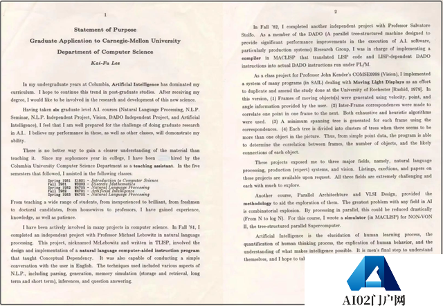李开复正式进入AI领域是40年前。那时,22岁的李开复正在申请CMU(卡内基梅隆大学)的博士。他在申请书中写到:AI 是对人类学习历程的阐释,对人类思维过程的量化,对人类行为的澄清,以及对人类智能的理解。
